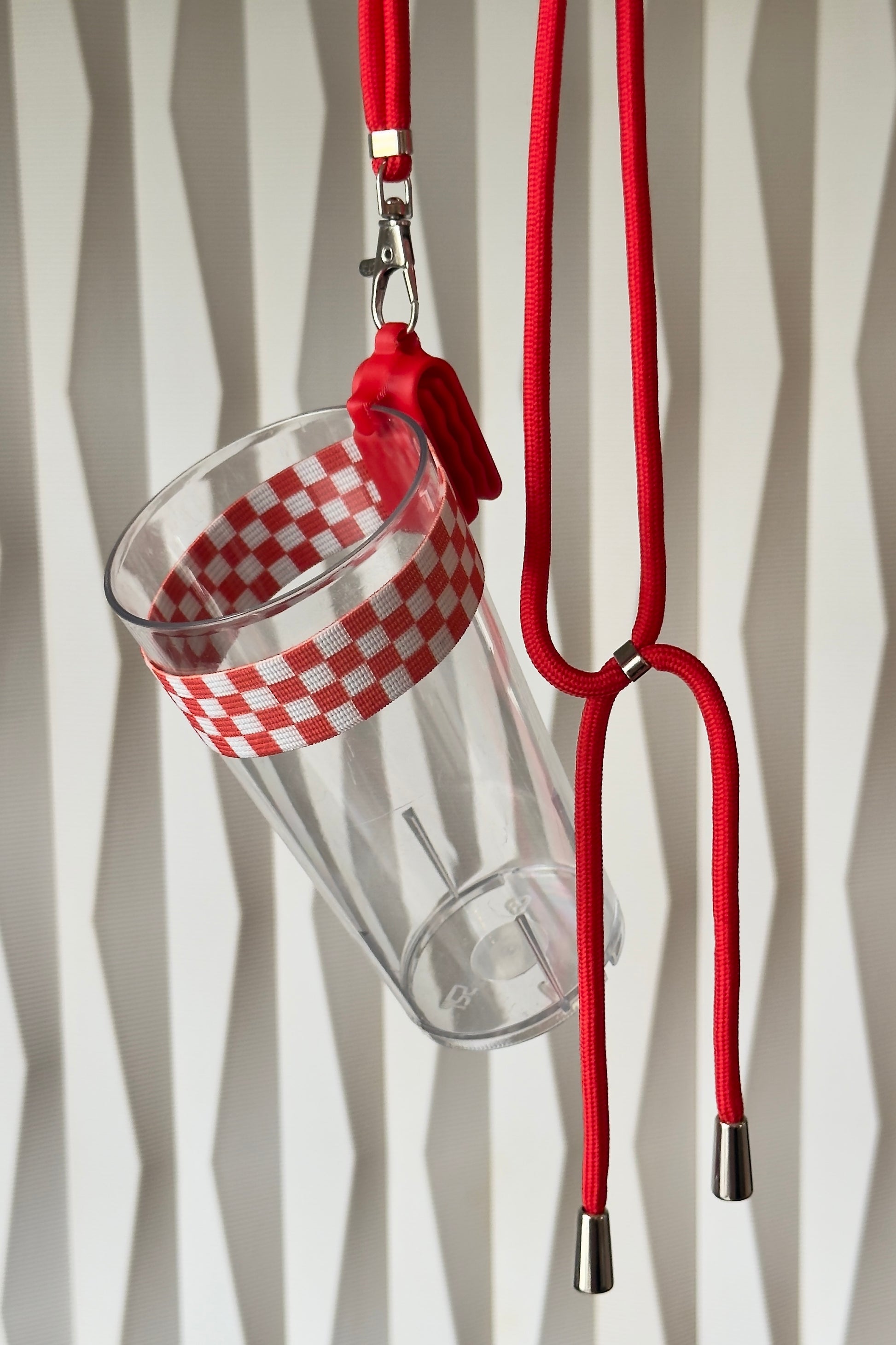 This Clip A Cup comes with a matching lanyard made of flexible cord. You can wear it around your neck, but because it is adjustable, it can also be worn over your shoulder!